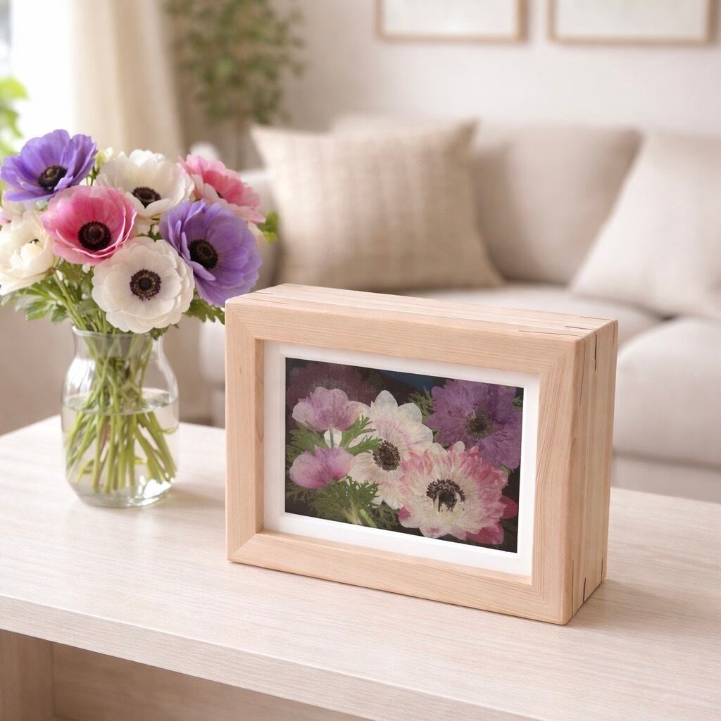季節のお花を押し花アートにしてひのきのBOXに詰め込みました!